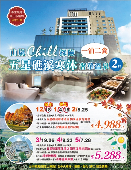 註 3:此優惠僅限本團入住五星礁溪寒沐酒店之房客使用,若有非住房之親友欲加購,恕不適用團 體優惠價,需依照飯店當日現場價格購買。